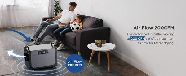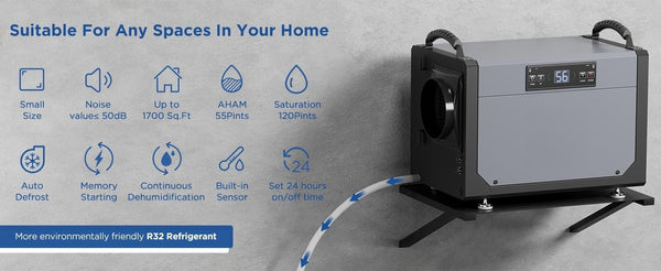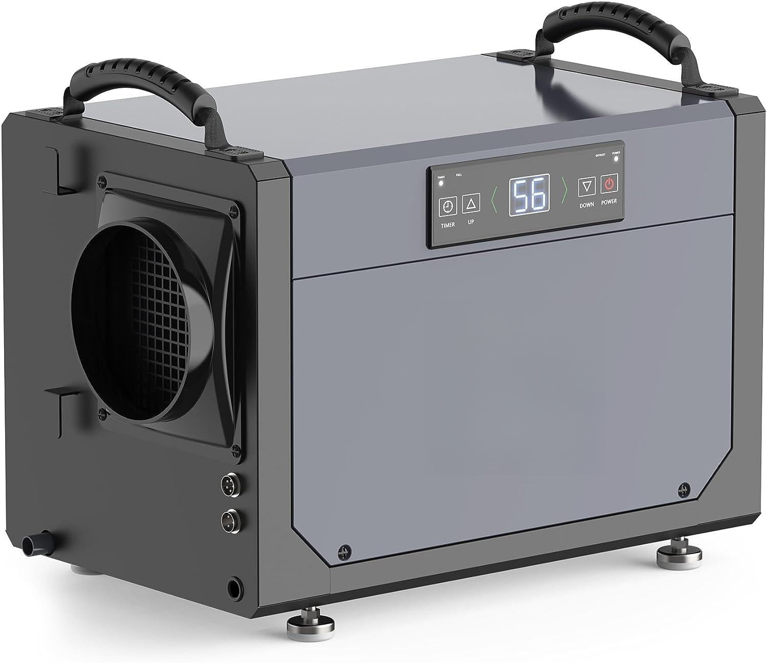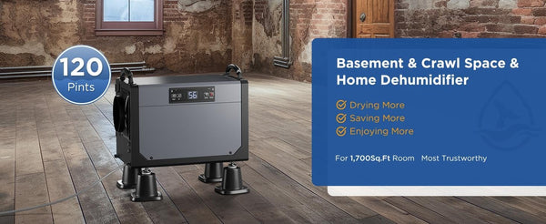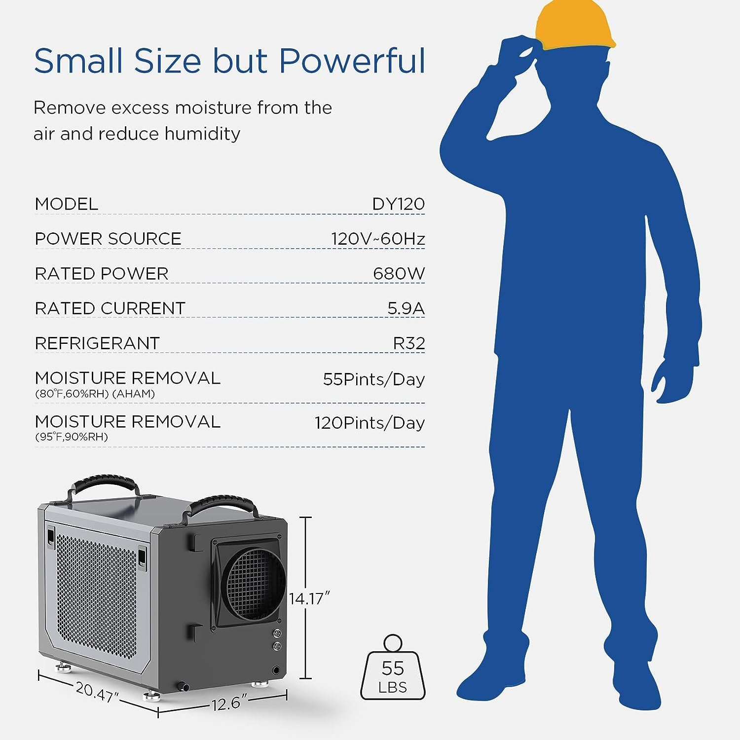 - 120 PPD Commercial Dehumidifier: Removing 55 pints of moisture per day in AHAM conditions, this unit can also remove 120 pints per day approximately in nearly saturated conditions. In spaces up to 1,700 square feet. Humidity setting range: 10-98% (± 1%).Its powerful 200 CFM fan moves air quickly through the unit, This dehumidifier is a good choice for even commercial spaces such as warehouses, factories, bars, restaurants, museums, garage and laboratories.