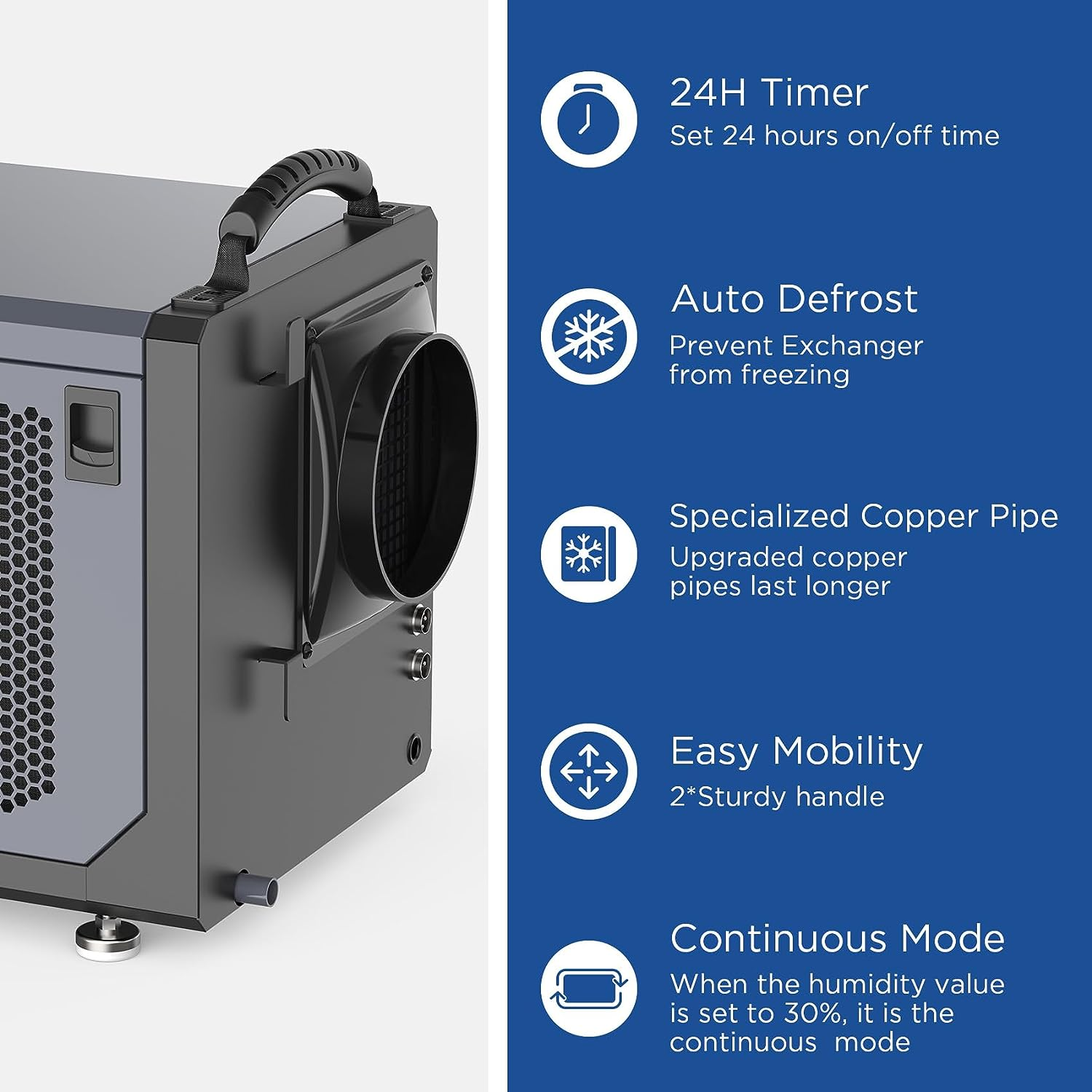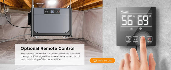 - Remote Control: Its intelligent touch panel, allows for easy operation. And have a 33 in extension cord(Purchase separately), so you can remove the touch panel and install it upstairs. Built-in humidistat relieves you from the hassle of manually adjusting its operations based on your humidity requirements. The dehumidifier will start or restart with the setting data before the outage.