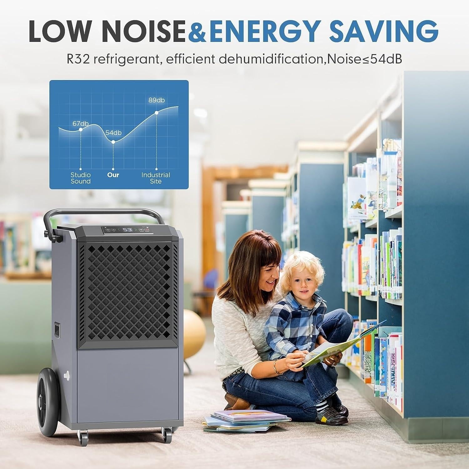 - Easy Mobility: This large industrial dehumidifiers is made of metal shell, which is collision-resistant and corrosion-resistant. It can withstand harsh water damage and high humidity working environment, ensuring long-term use and easy maintenance. It is equipped with a large semi-pneumatic wheel and a sturdy strip handle, and can be easily and safely transported from one place to another, even from downstairs to upstairs.