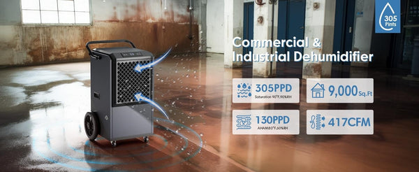 - 305 PPD Commercial Dehumidifier: New technology & New upgrade dehumidification is more powerful. The Commercial-Grade Dehumidifiers is capable of extracting 250 pints (130 PPD AHAM)of moisture per day (95°F, 90%RH) for areas up to 9,000 Sq.Ft. 417 CFM dehumidifying capacity.This dehumidifier is a good choice for even commercial spaces such as industrial,warehouses, gyms, factories, bars, restaurants, museums, garage and laboratories.