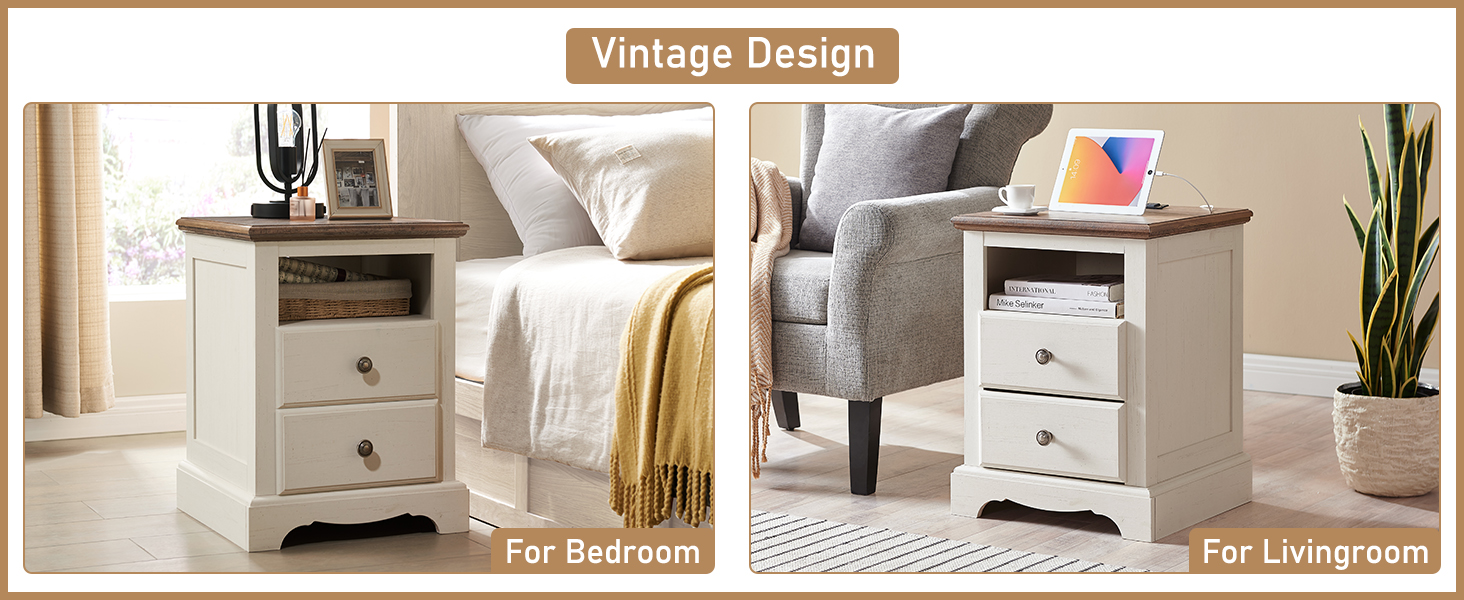 - Vintage Design - Classic bronze hardware knob pieces and has a brown top combined with a white color block design make this nightstand a bedroom staple. What a charming bed side complements for any vintage inspired enthusiast.