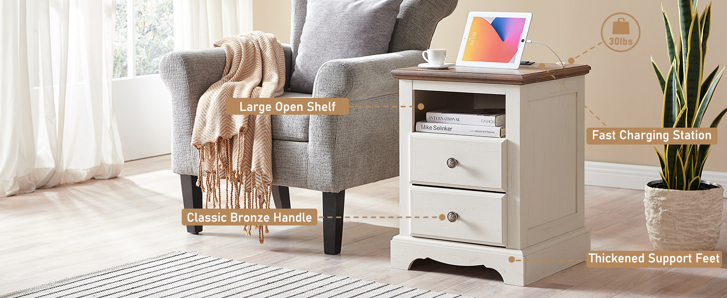 - Spacious Storage - Keep your essentials organized and easily accessible with twosliding drawers and an open shelf. The smooth gliding wheels ensure that thedrawers open and close smoothly every time. The tabletop is also perfect for matching various styles of table lamps.