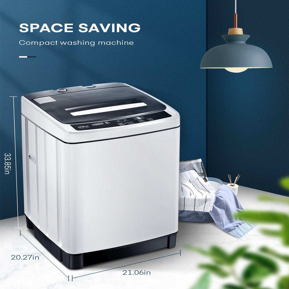 - 【Compact for limited space】If you are interested in whether its size wound fit your dorm, apartment, camping or RV. Then it will apeal to you because of its compact design exterior 27.4 x 16.1 x 31.9 inches and interior 1.5 Cu.ft. You can pour maximum lbs clothes once into this washing machine to achieve its best effect. And its energy saving plastic body ensures this machine will never be rust eater.