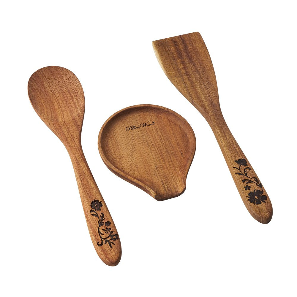 - 12" acacia spoon, 12" acacia turner, 8" chef knife w with sheath, 3.5" paring knife with sheath, 4 melamine measuring cups, and 4 melamine measuring spoons