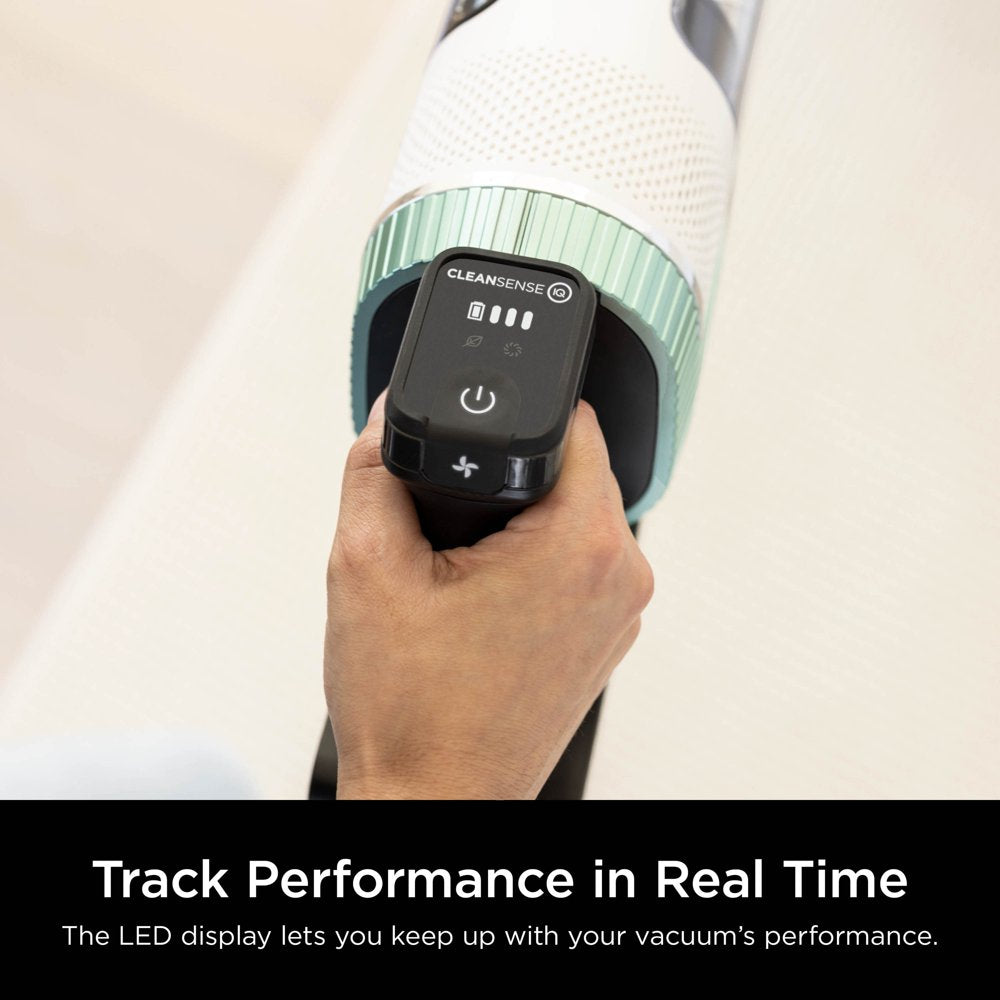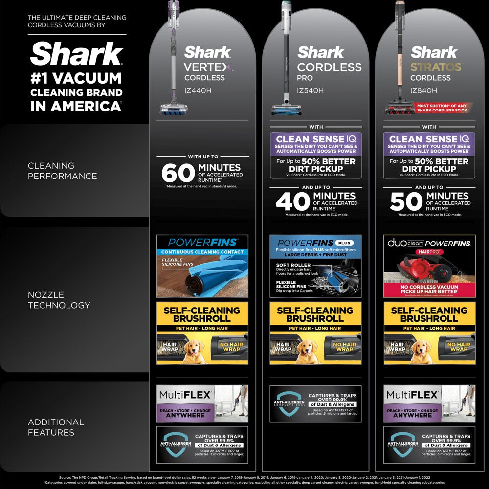 - CLEAN SENSE IQ: An infrared sensor detects the dirt you cant see and automatically increases power, giving you up to 50% better dirt pickup (vs. Shark Cordless Stratos in ECO mode).