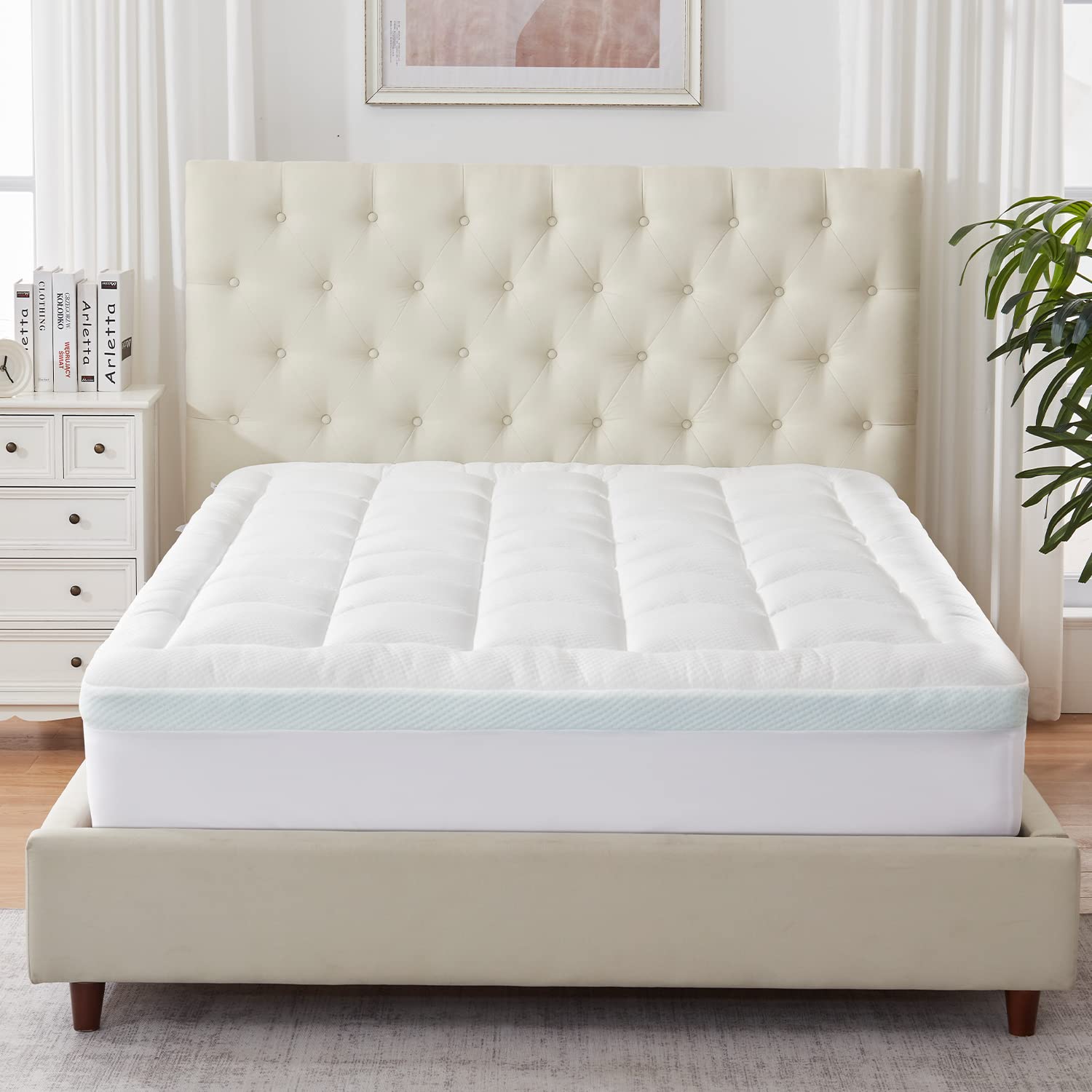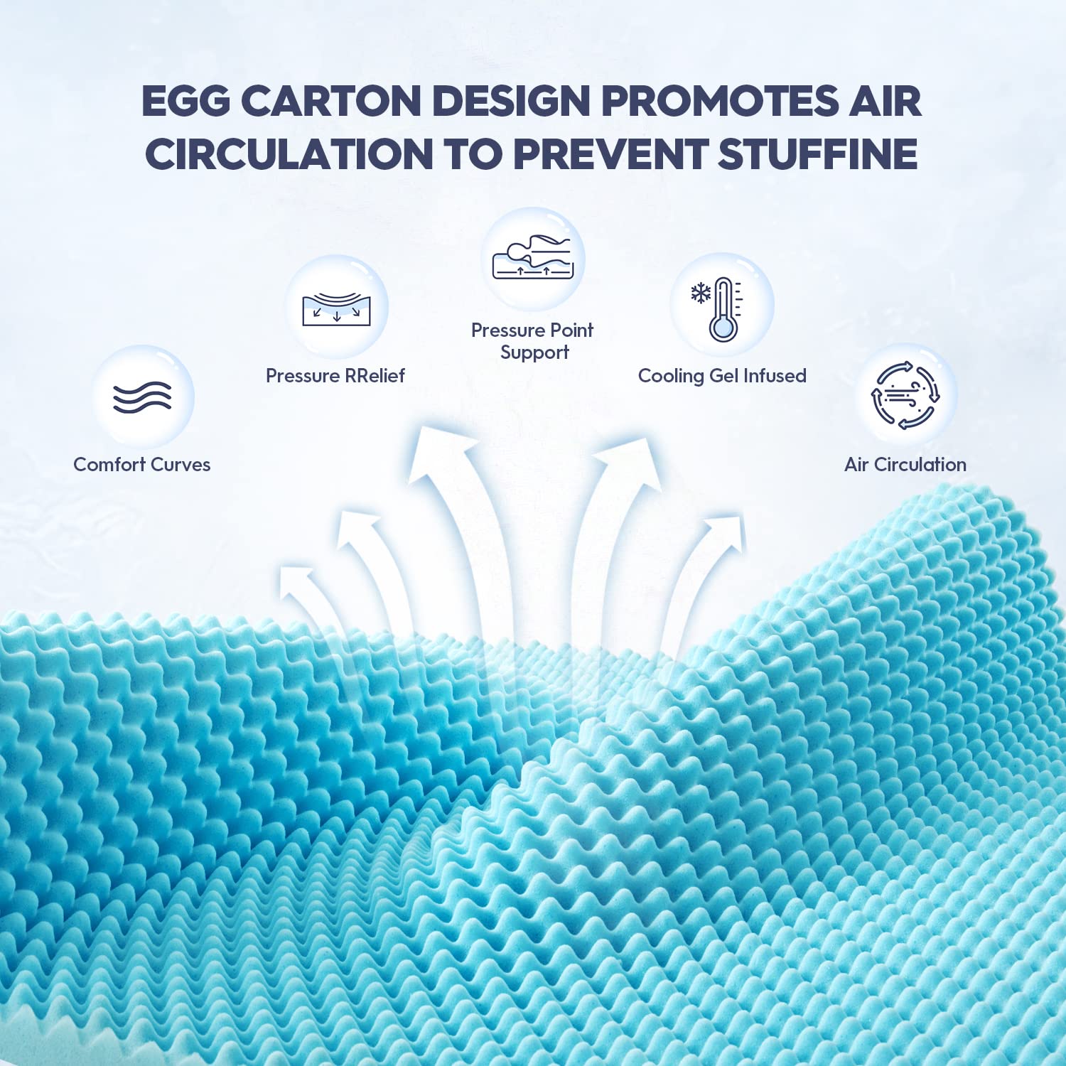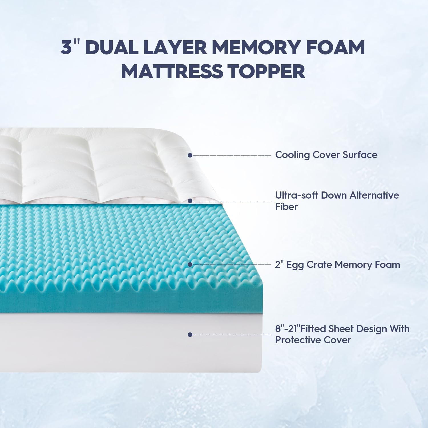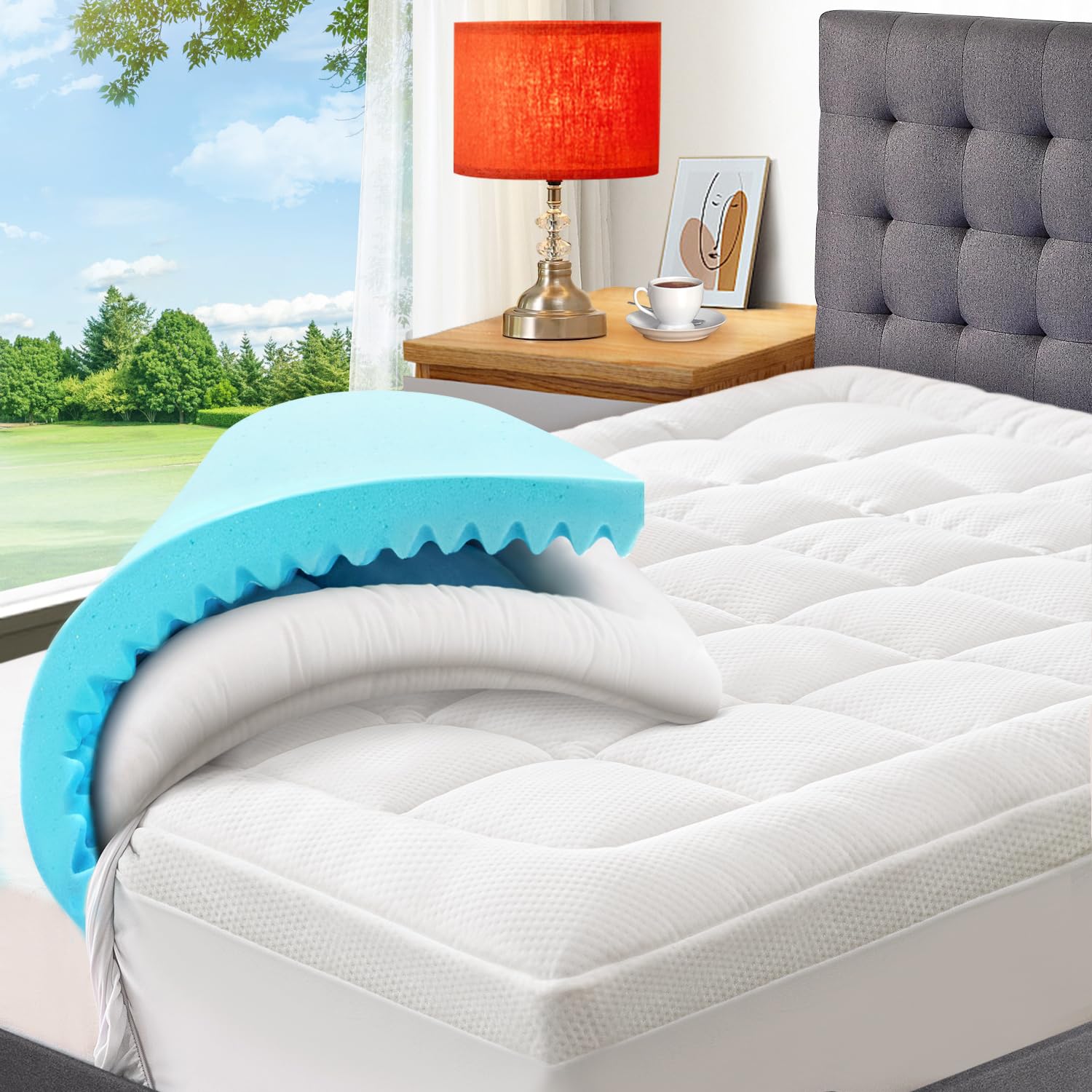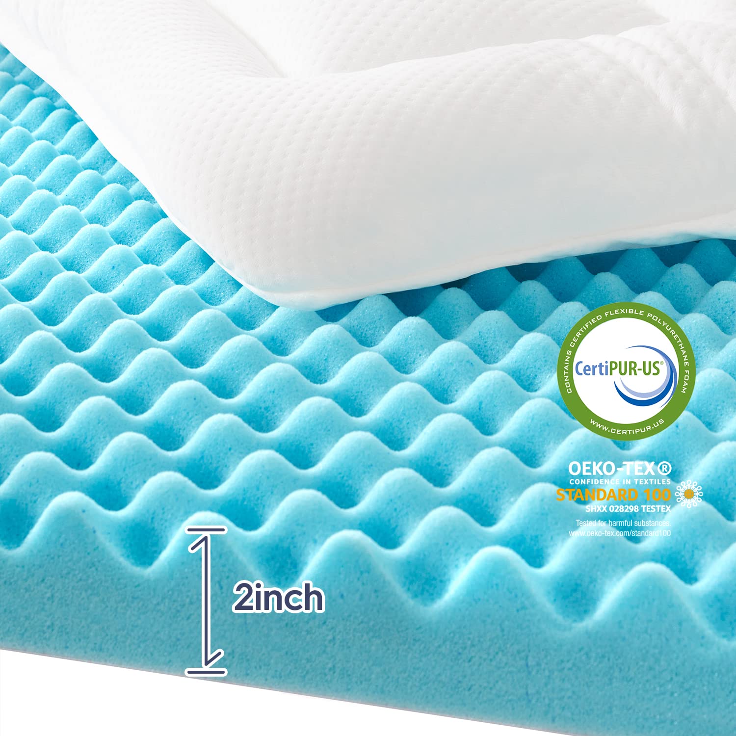 - 【Upgrade 2 In 1 Dual Layer Dsign】Features a bottom layer of 2 inch cooling gel infused memory foam pad and an extra layer of 1 inch squishy quilted pillow top cover filled with ultra-soft down alternative fiber. Comfort combined with gentle, pressure-relieving support.