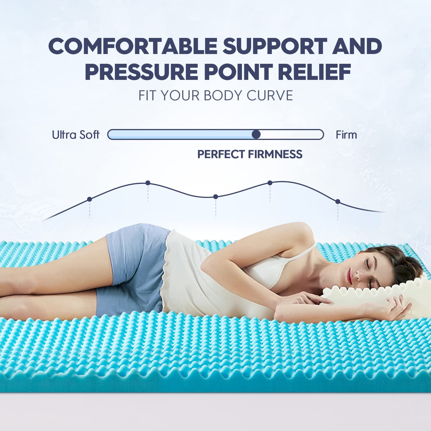 - 【Relieve Pain & Contouring Support】Designed to relieve pressure points. 38D responsive memory foam layer readily conforms to the curves and shape of your body to keep your spine in its natural alignment and prevent shoulder/back/neck pain regardless of sleeping position. The medium firm design totally transforms the firmness of your bed from way too soft or too firm to just right, immediately elevating your sleep into a delicious bliss.