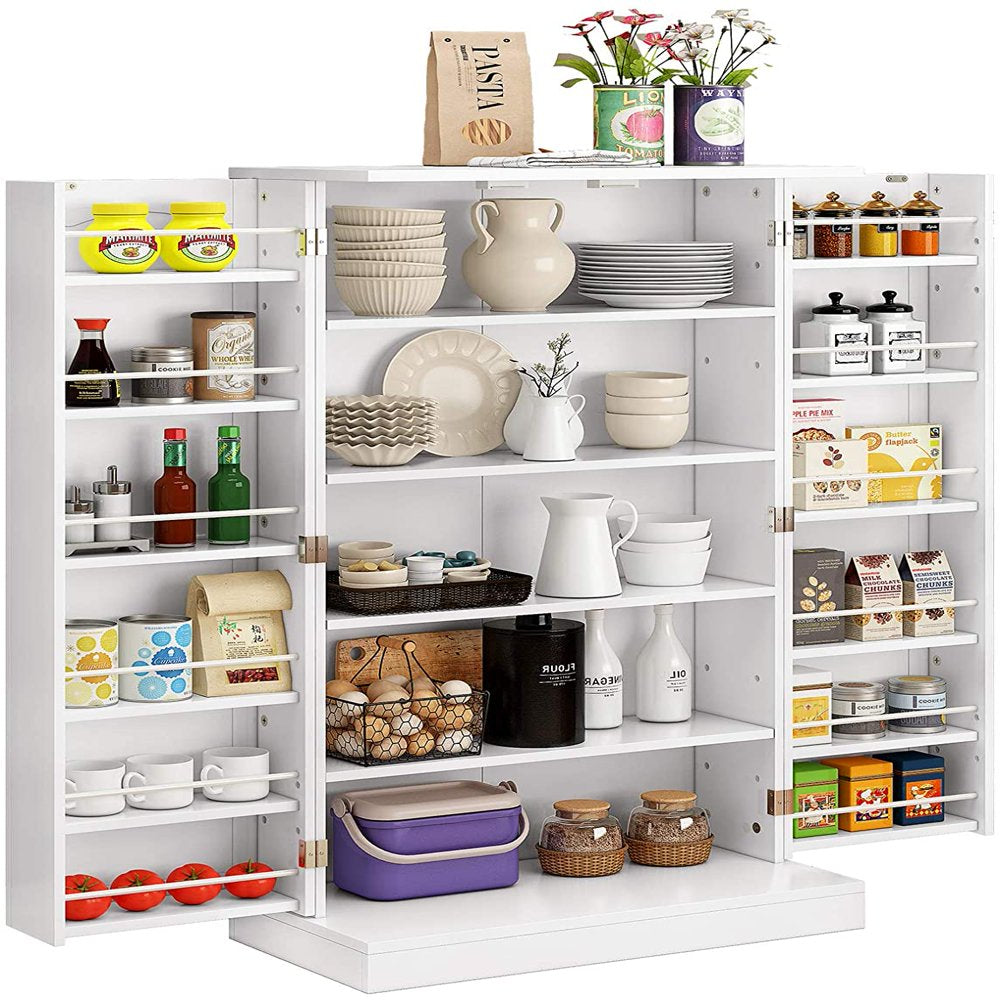 Whether you're working with a compact kitchen or just need to expand your entryway's storage capabilities, this white pantry is a must-have. Measuring 41" H x 23.2" W x 12" D, it features two cabinets that open to reveal 5 center shelves and 12 pockets along with the interior doors. Increase the storage potential of your kitchen with this versatile kitchen pantry. Streamline your space with the multi-storage cabinet. Functionality and style work in perfect harmony. Crafted from laminated MDF and particleboard, it features a clean-lined silhouette and a neutral solid finish for a versatile addition to any ensemble. Four adjustable shelves allow for a variety of different sized items to be stored within the cabinet, or remove all of the shelves to create a single large display alcove. Its design for classification will reduce your searching time. It is compact without occupying too much space.
