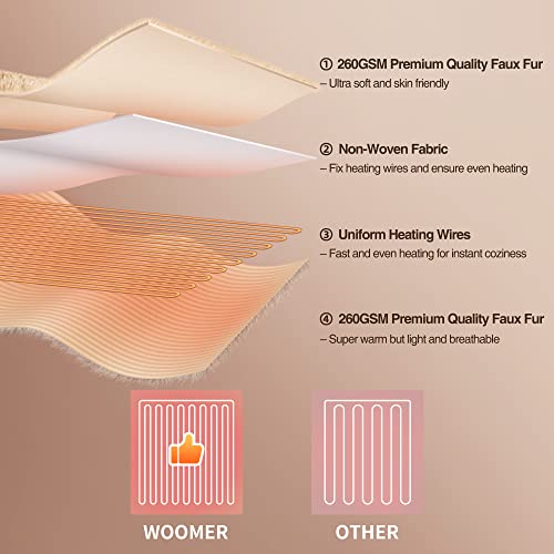 - [100% Usage Safety] ETL certified, overheating protection, 0.5h-12h auto-off timer setting, this Woomer heated blanket is qualified with every necessary feature to keep your heating time extra safe and secure.