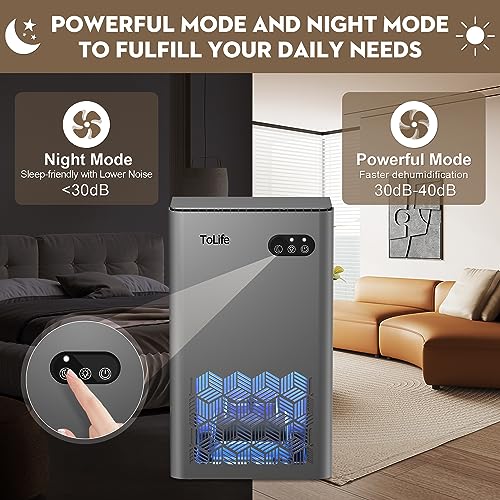 - 【TWO DEHUMIDIFIER MODES】-The dehumidifier offers a powerful mode that efficiently reduces humidity, allowing for quick and effective moisture elimination. Additionally, it has a sleep mode with a low-speed operation that operates quietly (< 30 dB) while you sleep. You have the freedom to switch between the two modes depending on your needs.