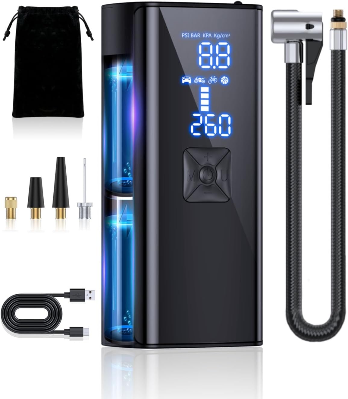 - 【Multiple Practical Functions】More than just a tire pump. There is also a USB-C input port/a USB-A output port, making it an emergency power source for mobile phones or other digital devices. At the same time, the top is equipped with an LED emergency light, which helps to provide convenience for inflating and changing tires in dark places.